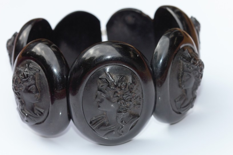 Whitby, in North Yorkshire, was the centre of jet jewellery making in the UK since pre-historic times but it was not until the early 19th century that it really developed as a major industry with significant jet mining being undertaken. The introduction of the railway led to Whitby becoming a seaside resort in the mid 1800s and jet souvenirs were popular. At the same time, the move from the lighter Regency clothing to the heavier crinoline and fuller clothing meant that larger pieces of jewellery could be worn and light jet jewellery was ideal for this. As well, mourning customs, for women in particular, became much stricter. Widows were required to mourn their husband for two and a half to three years, with the first stage of mourning, one year, requiring women to wear complete outfits in black, layered with black crape, including head veils. The second stage, which lasted six months, still required all black outfits but the layers of crape could be removed. For the third stage of the mourning period, women could wear grey, mauves and purple. Jet jewellery became essential.