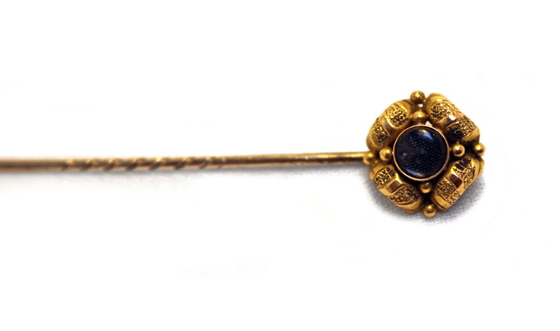 Stickpins were first used in the early 1800s to secure a cravat. Originally, the pins were smaller and quite dainty, but the pins became longer and the tops more ornate as the century progressed. The pins were straight or might have a have a barley twist to it. They could be gold or a base metal. They came with a clutch or bottom case to keep the stick in place and to protect the wearer. Most of these have disappeared.