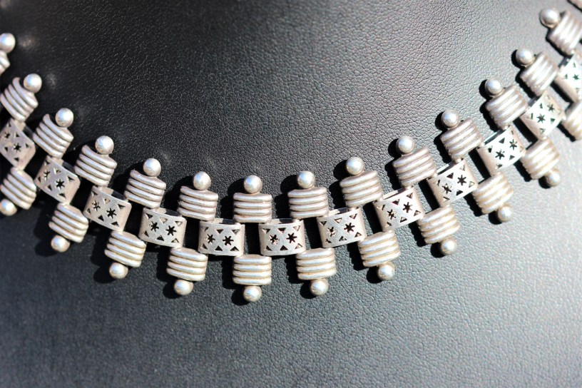Whilst silver jewellery was made throughout the Victorian period, it was the discovery of silver in Nevada which was to lead to a growth in silver, together with the ever growing middle classes who had money to spare. The opening up of Japan after 1854 led to an interest in Japanese culture and to the Aesthetic Movement in the 1870s. Silver collars in particular with oval or square shaped lockets became popular for everyday wear. The links on the collars were usually flattened to allow them to sit flat around the neck.