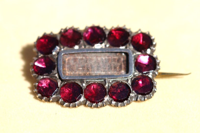 Georgian pins were mainly geometric in shape – squares and rectangles (some with clipped corners), and ovals. They were constructed with a central panel comprising a gemstone or paste stone, or a compartment covered with rock crystal in which could be placed hair of a family member or loved one, or it could be from a deceased parent or relative. The compartment could also contain a painting of lover’s eye or a silhouette. The central stone or compartment was then surrounded by gemstones like garnets, coral or jet, by pearls, particularly if a mourning piece as they symbolise tears, or it might be an ornate embossed or engraved gold border. Most of the pins that have survived today are gold, gold lined or pinchbeck.