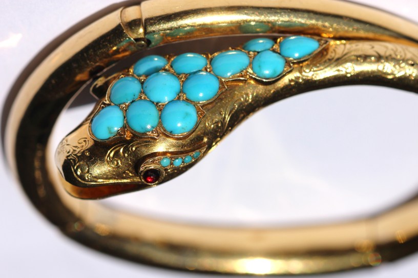 Turquoise imitants in later 19th century jewellery, particularly non-French jewellery, were more likely to be glass than odonolite. It is quite hard to identify such imitants although the use of the spectroscope and long wave UV can assist, plus the loupe and microscope. Sometimes, there may only be one or two imitation stones, probably replacing lost or damaged turquoise.