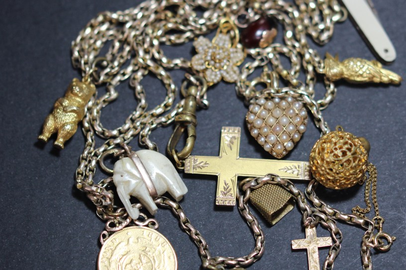 I have never been a fan of charm bracelets. They seem messy and noisy, with the charms hard to see clearly. They are very popular, though, and antique ones in particular fetch high prices at auctions. However, recently, I found an antique gold guard chain with charms and had a change of heart. The guard chain is long, about 60 inches (about 1500 mm), so can be looped around the neck twice, and came with about 10 charms. The charms include an ivory elephant, a tiny pen knife, a bear, a kookaburra, two crosses and a gold coin, I have added one or two to it.