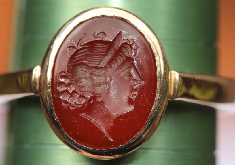 I am always looking for intaglio rings, antique ones if possible. They appeal to me for two main reasons. The first is because they usually involve gemstones which have been carved and the second is because they can represent a personal history of a family. Intaglio rings are created when artist carves down into the stone to hollow out an image. Usually they are designed as signet rings, originally used to seal a document but later in history they were used to display coats of arms or just initials. They were generally worn by men.