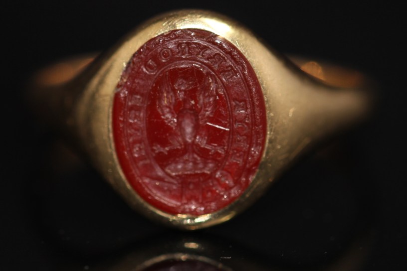 Personalisation of jewellery goes beyond putting one’s initials on the piece or even writing one’s name in gold or silver as part of a necklace or bracelet. For aristocratic families, having a seal or signet ring with an engraved family’s crest was essential for sealing documents and letters. The person was represented by the crest. Usually, there would be a motto under the crest. The signet ring below is engraved with a demi lion rampant and the motto ‘sans varier’ (without change). This is the family crest for the Charlton family, a border reiver family from Northumberland, England, dating back to at least the 14th century.
