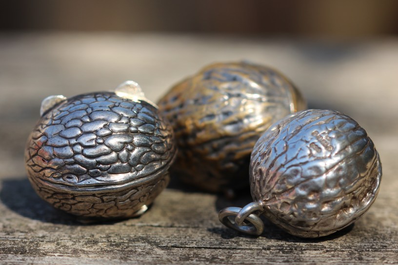 The next walnut is a hallmarked sterling silver pendant. It is heavy and is a little smaller than the first one but has a lovely wrinkled skin. I can’t quite read all the hallmarks so can’t date it but the lion (the quality hallmark for sterling silver) is clear.