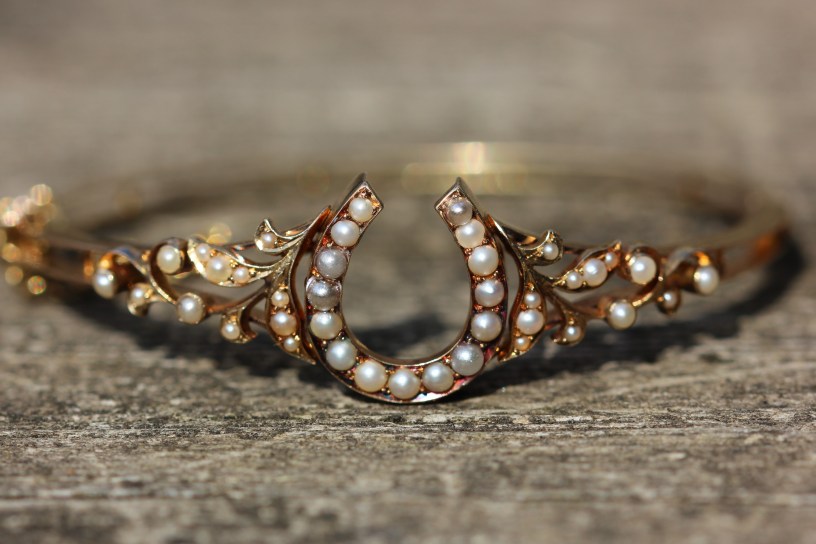 The final aspect of horseshoes to be discussed is the number 7, often considered a lucky number. Traditionally, horseshoes have 7 nails, although apparently 6 or 8 is more common. And 7 appears in a number of important groupings – there are seven days in a week, seven colours of the rainbow, and so on. In the Christian Bible, God made the world in 6 days and rested on the 7th. The number seven is also important in other religions and cultures. Looking at the photos above to see if they showed 7 nail holes, I found that while here are 7 nails in the horseshoe motif on the front of the gold locket, there are more than seven pearls in the earrings, bracelet and the pin.