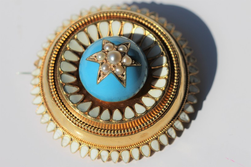 I am not sure when round brooches with domed or decorated middles came to be called ‘target’ brooches but it is easy to understand how the name arose. Targets for use with bows and arrows, then guns and finally games had central ‘bull’s eye’ sections, with radiating concentric circles. They originated from cross-sectioned tree trunks. The term was certainly an understood description in the Victorian era, particularly from the 1860s onwards. There are quite a few target brooches from this period, set with garnet or agate cabochons, or with a star motif often set in the middle of an enamel or turquoise bead dome. Certainly, many target brooches copied the style of jewellery being excavated in the 19th century, such as Etruscan and Viking sites.