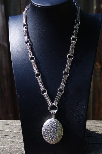 Whilst silver jewellery was made throughout the Victorian period, it was the discovery of silver in Nevada which was to lead to a growth in silver, together with the ever growing middle classes who had money to spare. The opening up of Japan after 1854 led to an interest in Japanese culture and to the Aesthetic Movement in the 1870s. Silver collars in particular with oval or square shaped lockets became popular for everyday wear. The links on the collars were usually flattened to allow them to sit flat around the neck. The pollution in England at the end of the 19th century was one reason why silver jewellery began to fall out of favour. The sulfur dioxide in the air tarnished the silver and cleaning became a constant chore.