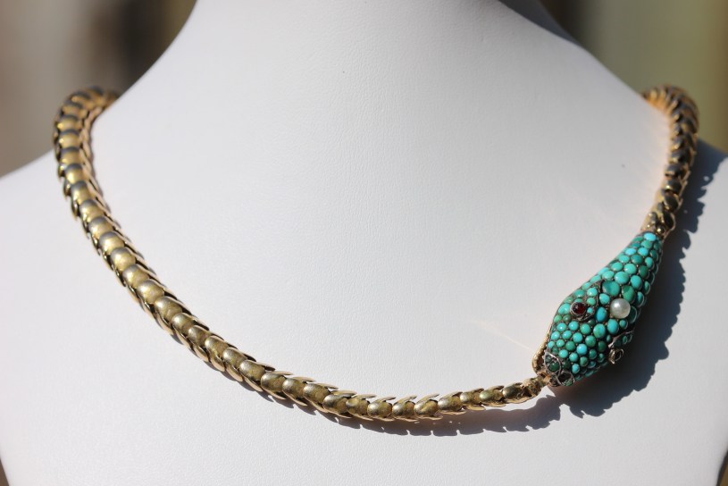 The first piece that so clearly indicates a piece of Victorian jewellery is a gold snake necklet. I have actually posted two photos of snake necklaces, one at the top of the post and one above. Snake jewellery was popular throughout Victoria’s reign, but was particularly so in two decades or so after 1837. Paintings around this time show women wearing snake bracelets and rings. Victoria’s betrothal ring was a snake shape. The more elaborate pieces of snake jewellery had diamond studded heads and bodies but less expensive items had turquoise or garnet set heads. The necklaces were worn close around the neck and either had a clasp entering the mouth of the snake or had a clasp that entered the side of the snake head with the snake usually carrying a locket in their mouths. Similar styles existed for bracelets or they had coils that wrapped around the writs. Snake rings could be single or double headed and were gem set either in the head, the eyes or both.
