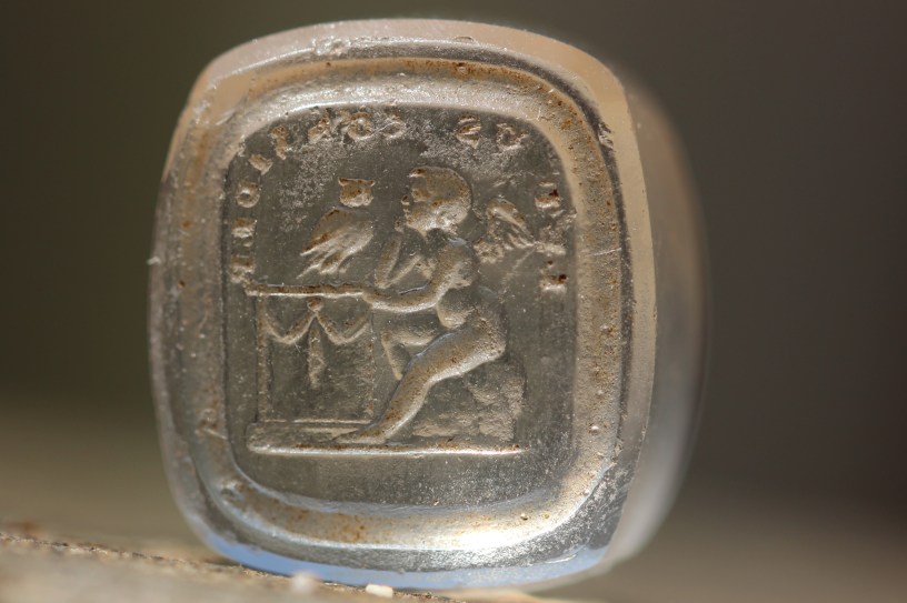 In Egyptian times, carved hardstones were used as seals, often in the form of scarabs but Greek and Roman artists began to produce images to be worn as decorative pieces as well as seals. They carved detailed images of the heads of famous people and gods and goddesses, as well as images from ordinary life and animals. The photo above has a Roman garnet intaglio with a man’s head and has been set in a more recent ring setting. Also, have a look at the carving of a man’s head in the intaglio below. The workmanship is amazing and you feel you could reach out and touch the man’s hair.