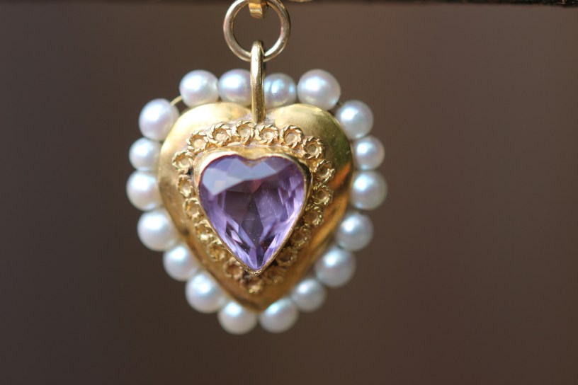 The heart-shaped amethyst set on a bar brooch is a little stunner. It is an lovely dark purple, about 10 carats, in size, and is set on an 18ct bar.