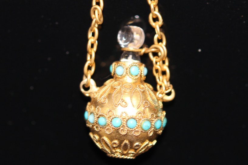 In the early 20th century, perfume bottle pendants remained popular, like the Bohemian glass bottle below, with gold enamelling, and the small antique gold bottle set with turquoise beads designed to be worn as a pendant which is the photo at the top of the post.