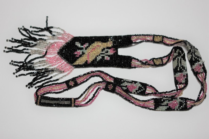 Long necklaces suited the style of dress and were worn both day and night. Lariats, beaded sautoirs, like the one at the top of the post, and pearls (real and fake) were common. Arms were bare so bracelets were worn. They might be a long necklace wrapped around the arm, a series of jangling gold bracelets or just one, set with gemstones like the one below.