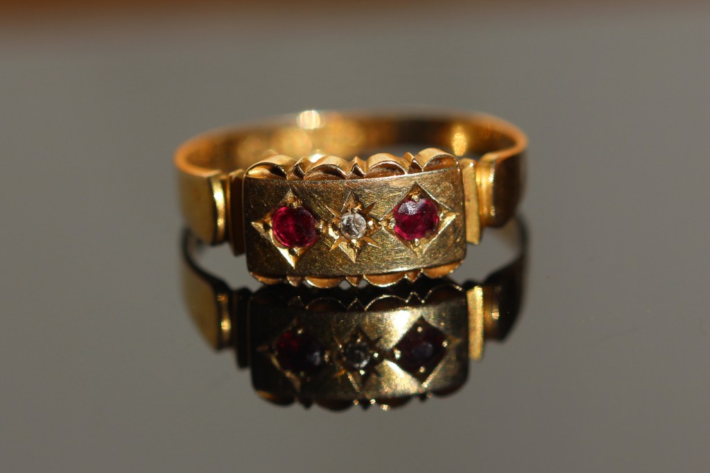 The little late Victorian 18ct ring (1896-97) above is set with two small rubies and one diamond. The stones have been gypsy set. It is a very typical ring from this period.