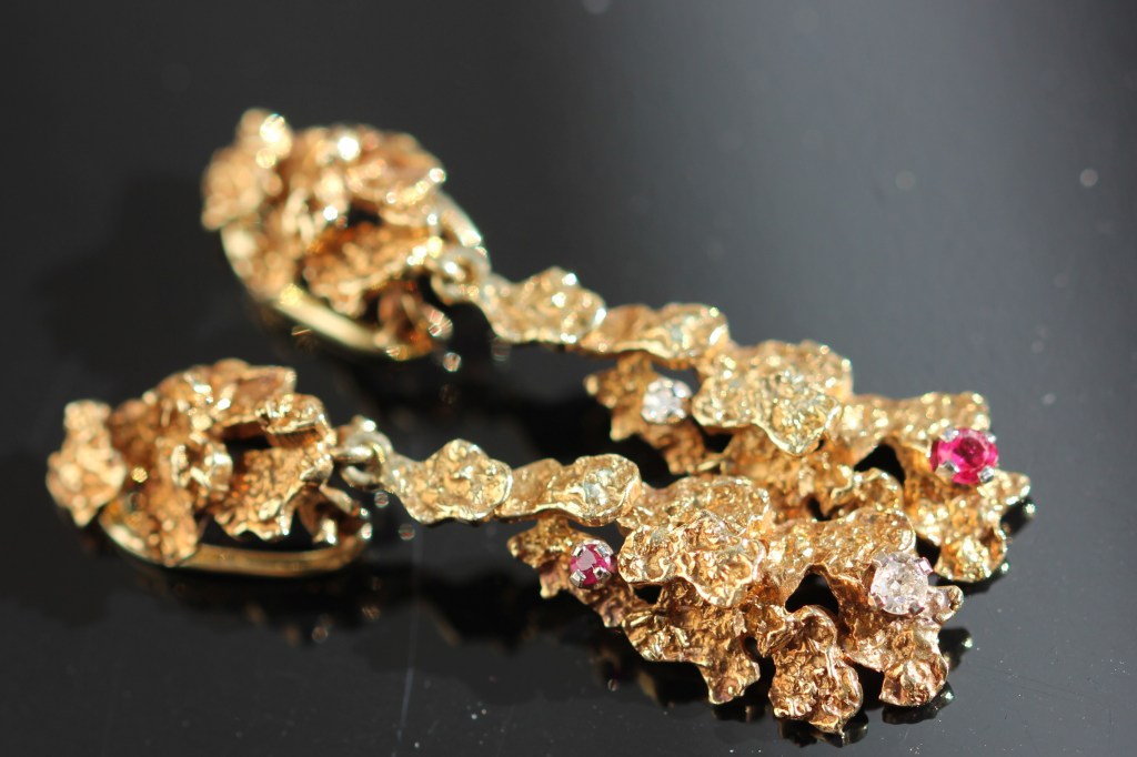 The vintage gold earrings above have a small ruby and diamond on each one, with the position of the gemstones reversed.