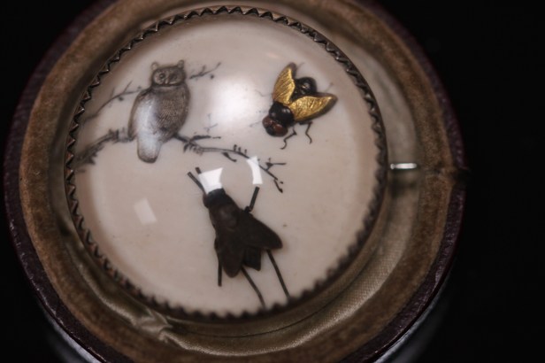 It can easily be mistaken for glass. One easy test to ensure that an item is rock crystal and not glass is to place it over some printing. The rock crystal will magnify the writing while the glass has no effect. This magnifying effect was used to enhance pieces of jewellery in cases like reverse crystal jewellery. In the brooch below, the painted insects are magnified by the rock crystal dome over them.