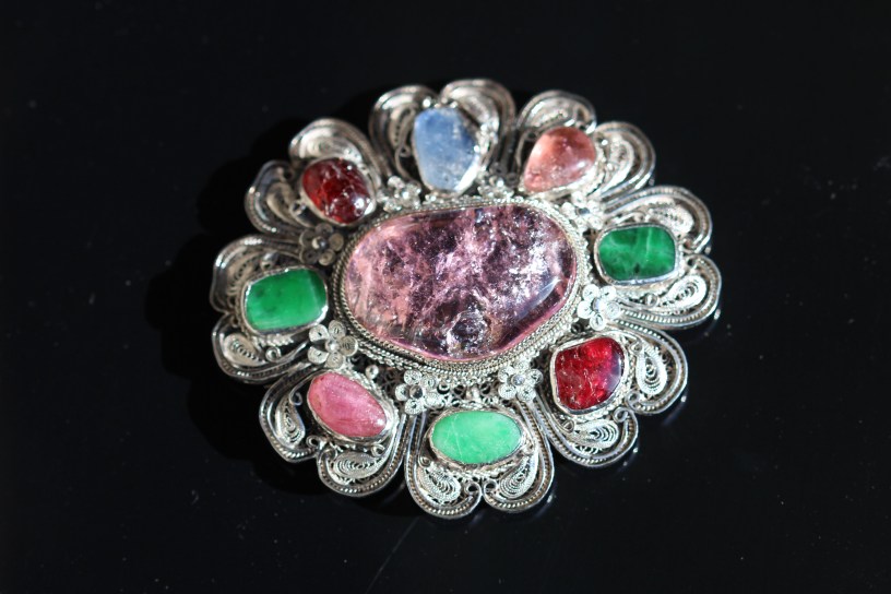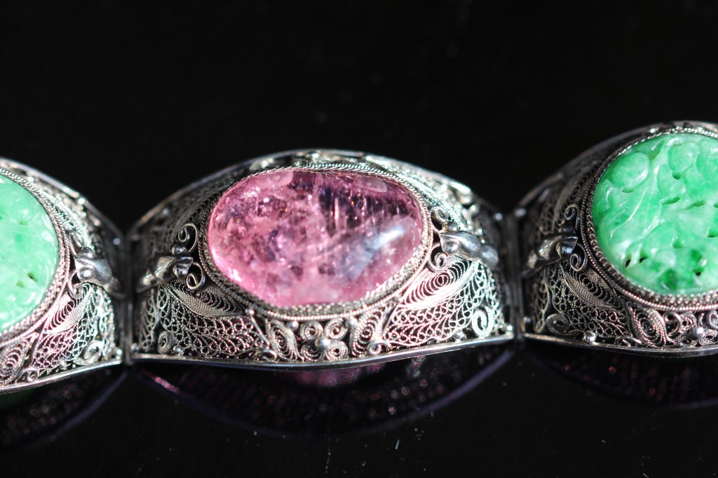 Rose quartz is a lovely pale pink gemstone. It usually has a lot of internal clutter – fissures and suspended matter. It is used for cabochons and beads, sometimes earrings and pendant. The photo at the top of the post of the vintage Chinese silver brooch and the one below of a bracelet are good examples of how it is used in jewellery.