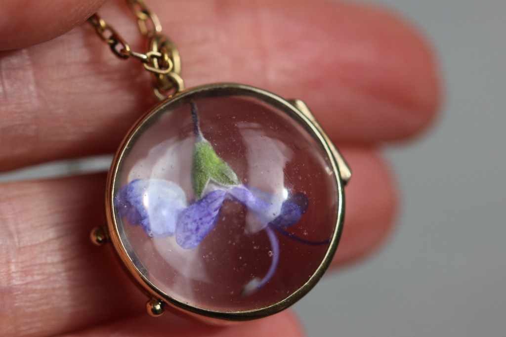 Similarly, ‘pools of light’ jewellery, which was popular in particular in the Edwardian period from 1900 to 1914, used this effect. This jewellery involved the use of crystal quartz as simple un-drilled balls or domed halves. Pieces like this were described as being ‘pools of light’ because of the way the light reflects through the gem. Sometimes the light passing through results in the gem glowing almost white. They will also render anything viewed through it upside down and in reverse. They were often designed as two halves of a locket so that a photo placed inside the two halves would be magnified, as in the case of the locket below, which contains a tiny flower from a rosemary bush.