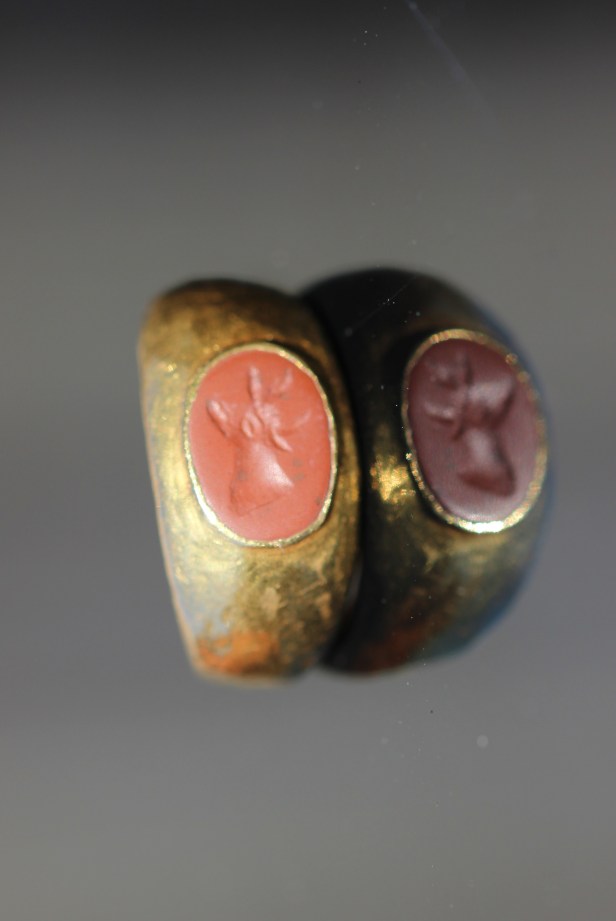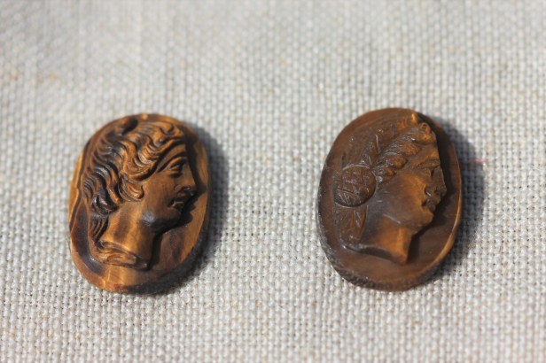 There are a few more quartz that I want to discuss. The first is the tiger’s eye. It is a macrocrystalline quartz, (along with rose quartz, amethyst, etc) It can be translucent to opaque and contains cat’s eyes chatoyant stripes. Chatoyancy means that the stone shows a band or bands of bright lustre caused by reflection from inclusions in the stone. The bands in tiger’s eye are caused by asbestos fibres in the stone. The stone is usually gold or a gold brown. The two cameos below illustrate the light gold banding in the stones.
