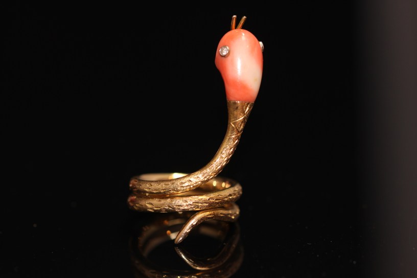The second ring, which is shown at the top of the post, is quite different. Made by Larry, a Hong Kong and Singaporean jeweller, it comprises a coral snake head set with diamonds for eyes and with a gold forked tongue. The etched gold band wraps twice around the finger. The long head lies along the finger. Not a ring for everyday use but for a special occasion.