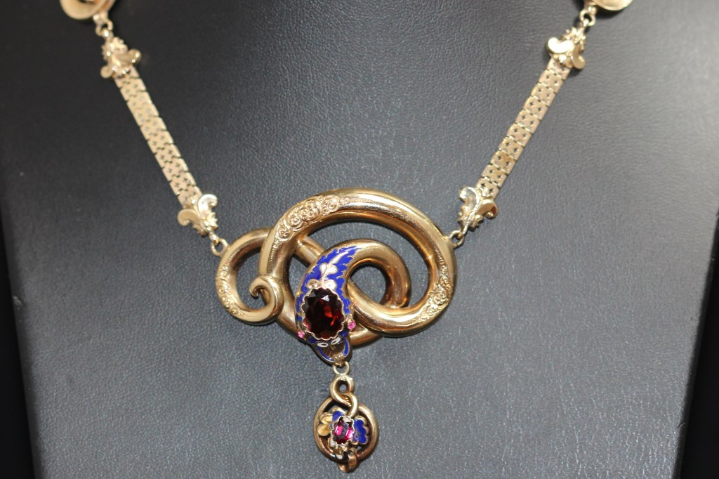 It is nice, sometimes, to just sit back and look at some new and not so new purchases. So here are a few pieces that might be of interest, all of them snakes. The first is a delightful antique 15ct snake necklace comprising a coiled snake covered in blue and white enamel and having a garnet gem set in the top of its head. It has garnet eyes. Hanging from the mouth of the snake is an oval gold ring containing a central blue and white enamel oval shape set with a garnet. The coils of the snake have three finely engraved segments. The attached chain is lovely and ornate. This necklace is from around the 1880s. This is a later style to the snake jewellery that was popular around the 1840s.
