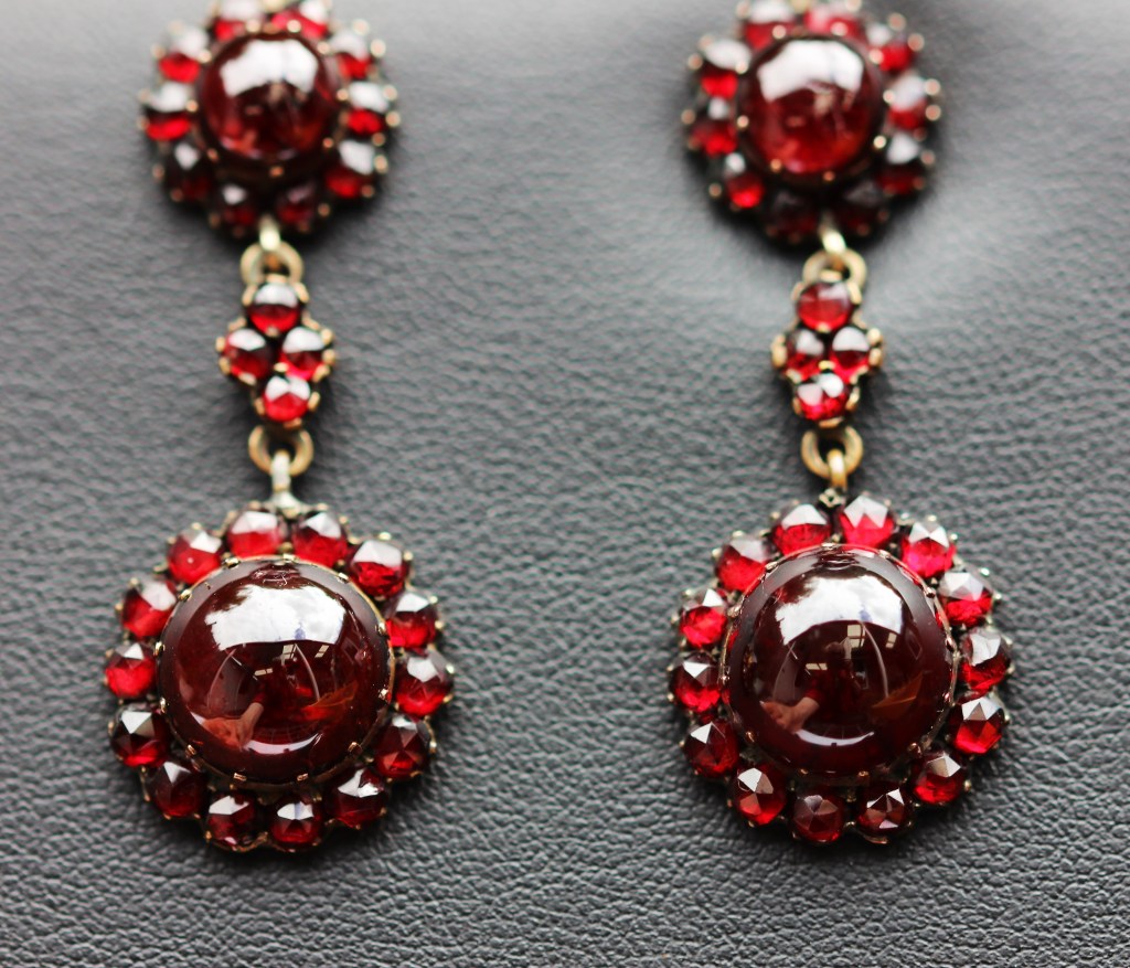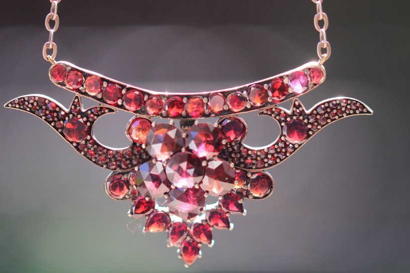 Bohemian Garnet Jewellery – Garnets from Bohemia (later to become part of Czechoslovokia) had been mined and used in jewellery for centuries. The garnet was predominantly the pyrope garnet, a blood red to black red coloured gem. The industry grew in the 16th century with sponsorship from Rudolf II, the Holy Roman Emperor, Archduke of Austria and the King of Hungary, Croatia and Bohemia. Originally centred in Prague, the processing of the jewellery moved to the town of Turnov. In the 18th century, new rivet technology enabled the binding of small stones into a compact face resulting in pavé-set clusters of multi-faceted stones. This enabled smaller garnet stones to be used. The jewellery was mounted either in gold, often low grade, but also in silver gilt or metal. A typical design used rose cut garnets clustered around a garnet cabochon in star shaped patterns or flowerheads. They produced a range of pieces from drop earrings, brooches, pendants and necklaces. Some of the pieces were very elaborate. The settings were usually closed at the back