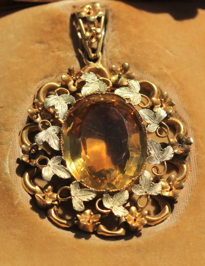 Another yellow gemstone, the citrine, was added as a November stone in 1952. The name ‘citrine’ comes from the French word for lemon which is ‘citron’. A member of the quartz family, it can range from a light lemon yellow to a gold yellow. As seen in the pendant below, it glows beautifully when set in gold.