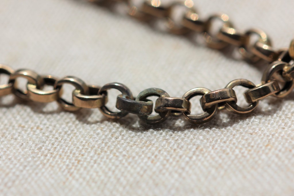 Similarly, with gold, start with a gold cleaning cloth, then, if more cleaning is needed, use a soft toothbrush and soapy water. The chain above had four sections of discolouration. I started with the soapy water and brush first, then moved onto the gold cloth, removing all the problem areas. Other gold jewellery may have only slight discolouration, like the scarab brooch below which just needed a light polish with a cloth. You are not trying to return it to as new but want to retain the patina of age.