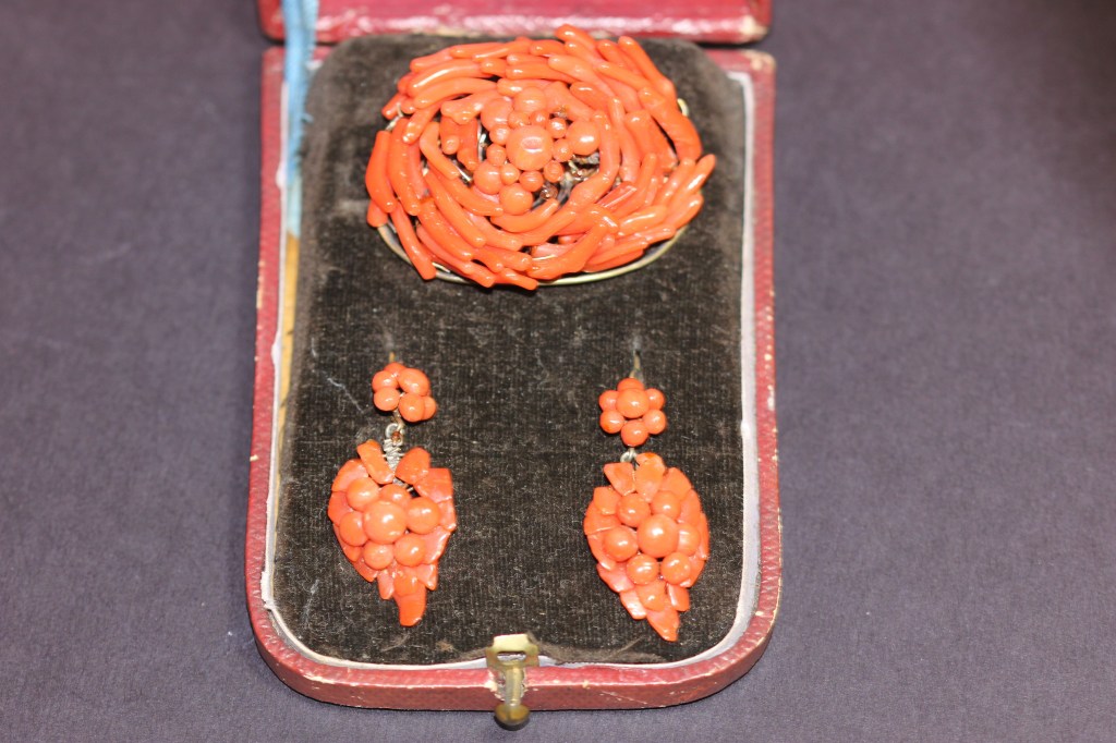 Coral jewellery was also a popular souvenir. The town of Torre del Greco near Naples was then the main coral fishing area although processing and carving of the coral was undertaken in Livorno. The coral was often carved with beautiful cameos of Greek and Roman gods, flowers, and criss-cross patterns. The pieces available ranged from high quality Architectural Revival parures and earrings with classical motifs such as bull’s and ram’s heads, urns and amphoras, and carved medusa heads to small coral charms, often of hands and hearts. In 1876, a School for the Manufacture of Coral and Cameos was founded by Umberto I to train coral carvers and engravers was established in Torre del Greco.
