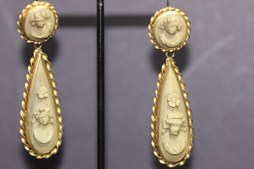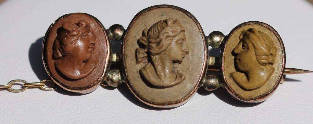Lava jewellery, said to contain lava from Mount Vesuvius, was very popular with Grand Tour visitors. The lava came in muted brown, grey, greens, ochre and cream, and skilful artists carved and polished beautiful cameos which were turned into bracelets, brooches, pendants, earrings and necklaces. The carvings were usually of classical heads or great Italian artists or writers. As the stone is quite soft, the cameos were usually carved in high relief which means they can suffer from damage over time.