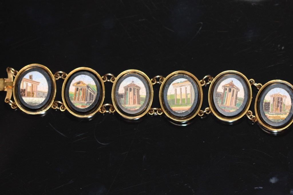 Rome was the last leg of Kate’s Italian tour and as well as visiting churches and museums, she again shopped for jewellery, this time, micromosaic jewellery. Miniature glass mosaics, called ‘micromosaics’ began to appear in the late 18th century. There were two main impetus for the creation of micromosaics. The first was that, in 1737, a Roman mosaic was excavated in Tivoli, Italy, one which appeared to have been described by Pliny. The mosaic was a picture of doves drinking at a bowl, becoming known as the Doves of Pliny, and it was created out of small stone tesserae , about one tenth of an inch square, which were the smallest ever discovered. The mosaic became a popular tourist destination in Rome. The second impetus was that a craftsman in around 1731 had produced glass in a range of new colours that were matt and opaque and that were an improvement on the glass produced in Venice. The enormous range of colours meant that mosaic craftsmen could produce very realistic pictures with lovely shading and depth. Rome became the centre of the micromosaic craft.