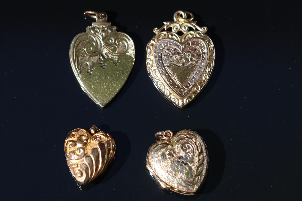 The heart symbol can very simple, like the tortoiseshell heart at the top of the post, or more complex, like the heart surround to this lovely blue paste stone above, with its seed pearl detail and bow at the top. Victorian heart shaped lockets, pendants, and charms, like the four examples below, are common, and heart shaped jewellery is still just as popular today, particularly on Valentine’s Day