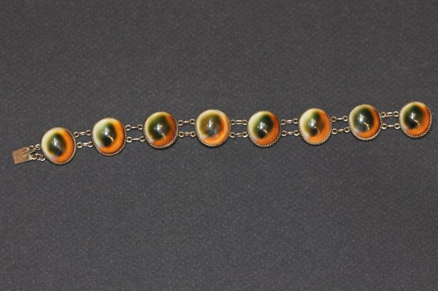 Some opercula jewellery was set in a base metal, but some was set in silver and gold. All of the pieces in the photographs are set in gold.