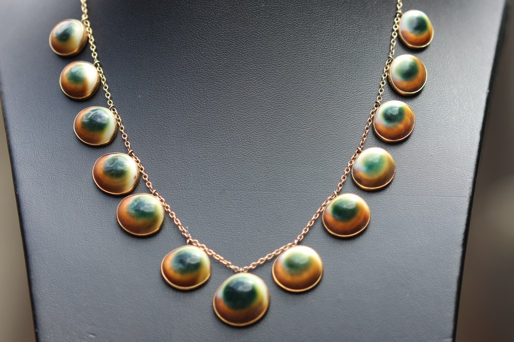 Some of my favourite jewellery is made from Turbinidae, turban snails, a family of marine gastropod molluscs. These molluscs have external shells, shaped like a turban, which are big enough for the soft body of the mollusc to withdraw completely into it. Some of these molluscs have a trapdoor that they shut to keep out predators. When in use, the trapdoor is flexible but it hardens when the shell is no longer occupied. It is this trapdoor on turban shells, known as an operculum, which is turned into jewellery.