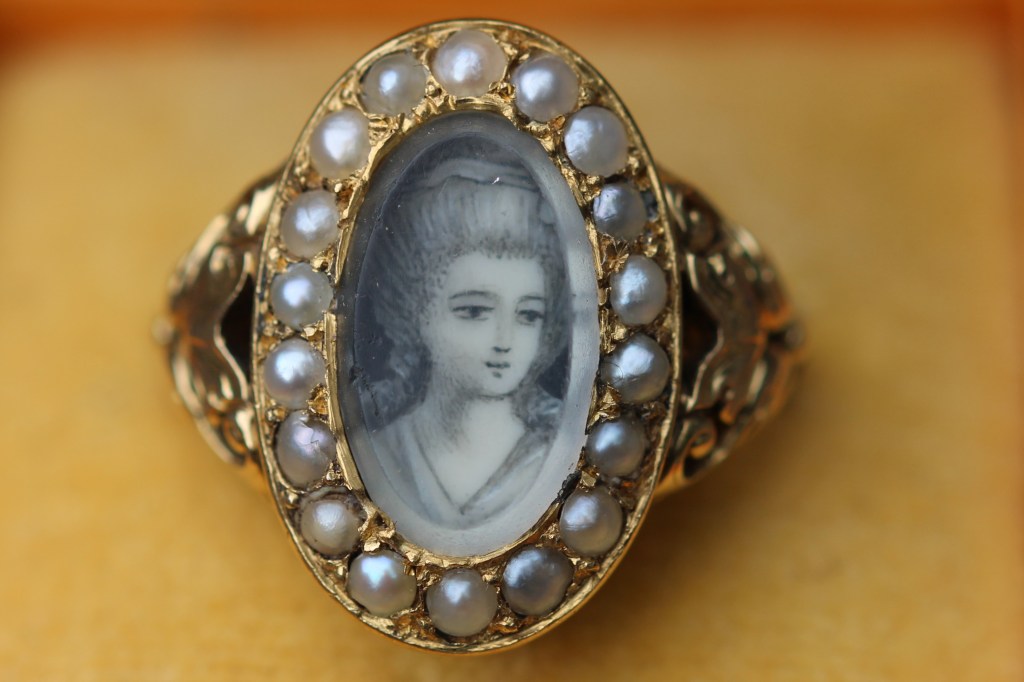 Sentimental rings were popular. Those in the shape of a heart, with or without clasped hands, were still common, versions of the Fede, the Gimmel and the Claddagh rings. Acrostic jewellery, spelling out words like ‘dearest, regard and adore’ in gems were shared between lovers. The French ‘Toi et Moi’ (You and Me) ring which comprised two stones set in a ring next to each other without touching each other achieved prominence when Napoleon gave one to Josephine in 1796. Other sentimental rings had handpainted miniatures set in a ring with a pearl surround.