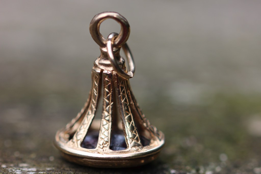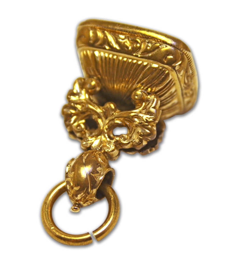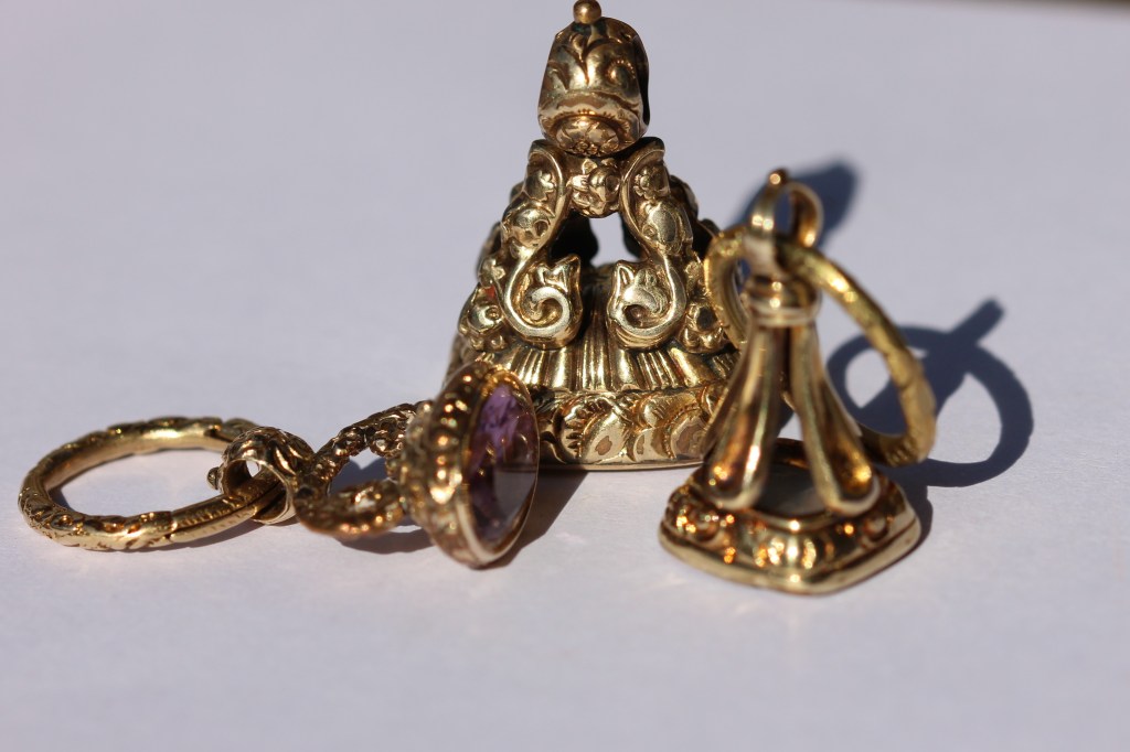 In the 17th and 18th centuries, the seals were used to seal documents and so on, but from the mid 19th century, they became purely decorative. While some might be engraved with the wearer’s initials or family crest, many just contained a hardstone (usually agate or jasper) or gemstone without engraving. The setting might be very ornate with a lot of rococo flourishes. The size of decorative fobs varied, although most were about 3 to 4cms high. They are all different but show extraordinary detail in design, engraving and embossing.