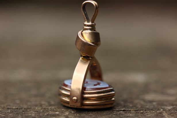 As mentioned in the previous post, the attachments to the vest chains were called fobs. These little fobs took a number of forms. Some fobs were seals, used to authenticate documents and seal letters. They usually had gemstones set into a gold or gold chased frame. It is fob seals I want to talk about. Some were fixed, allowing one side to be the main focus, while others were double-sided, able to swivel to show off the different sides of the fob. Bloodstone, a green jasper with red specks, was often used on one side of such fobs. They were also known as spinner fobs. Others fobs contained the insignia of a regiment, a sporting club and some other allegiance.