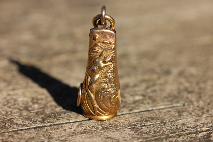 Another typical fob is a cigar cutter, like the one below and at the top of the post. This magnificent Art Nouveau piece has a naked lady depicted on the front and back, amid swirls of engraving and scrolling.