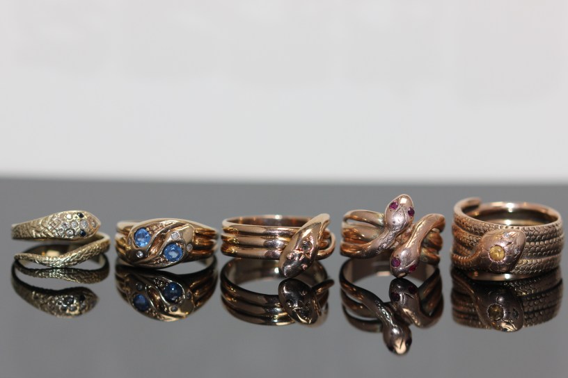 I just love snake jewellery and I am not surprised that they have continued to be depicted in jewellery since antiquity. The sinuous shape wraps around the finger, wrist or neck, or acts as a border around a brooch or pendant. Snake rings, earrings, necklaces, brooches and rings, they just keep coming. Once a year, I show you some snake jewellery so here are some for 2021.