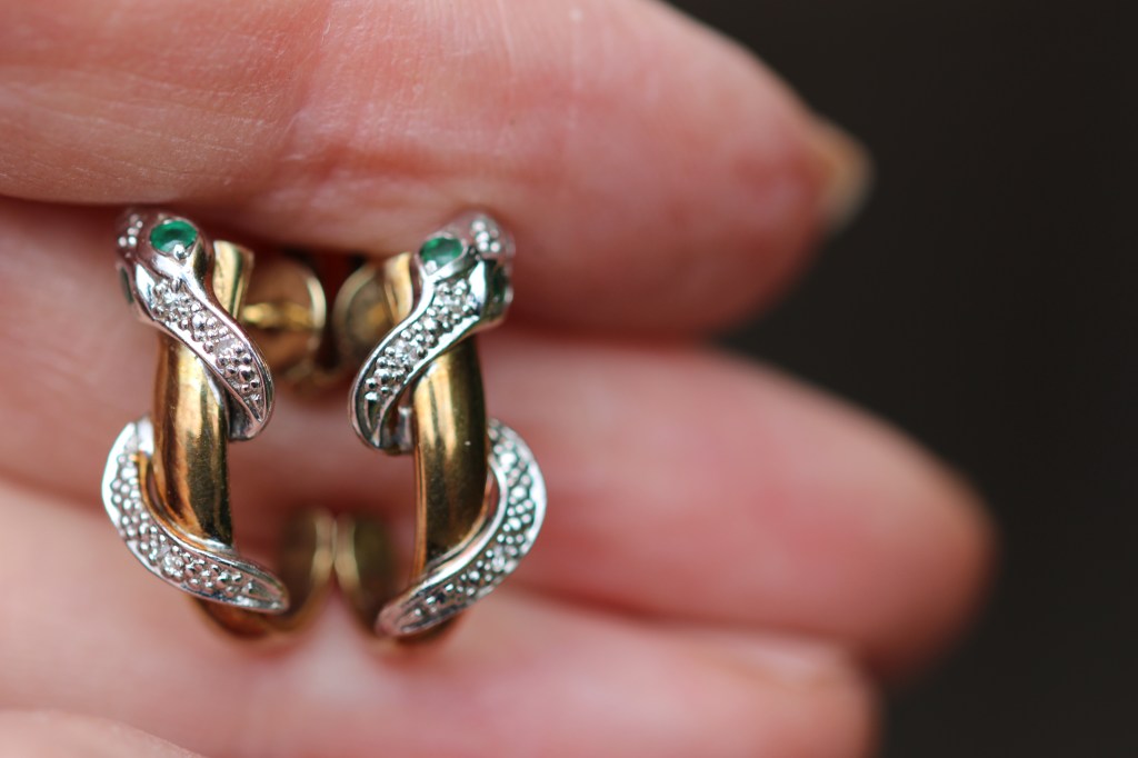 My third snakes are lovely vintage 9ct snake earrings with ruby eyes. There was quite a resurgence of snake jewellery produced in the 1960s and 1970s in the UK, all with lovely coils and ruby eyes.