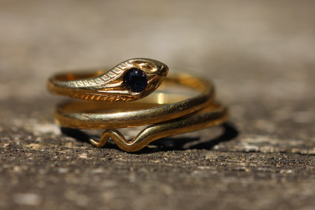 The next snake is a vintage 18ct gold snake ring with a black spinel in its head. It has lovely etching around the head to represent its scales and in style reverts back to those popular in the early Victorian period.