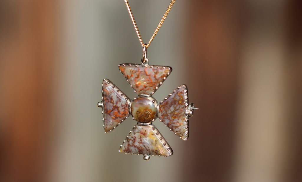 One cross used a lot in antique jewellery is the Maltese Cross, as in the photo below. This is a cross which is similar to the Greek Cross except that each tip of the bars is flared (β ). An example of such a cross in moss agate is below. The cross was associated with the Knights Templar, the Sovereign Military Order of Malta and Order of St John.