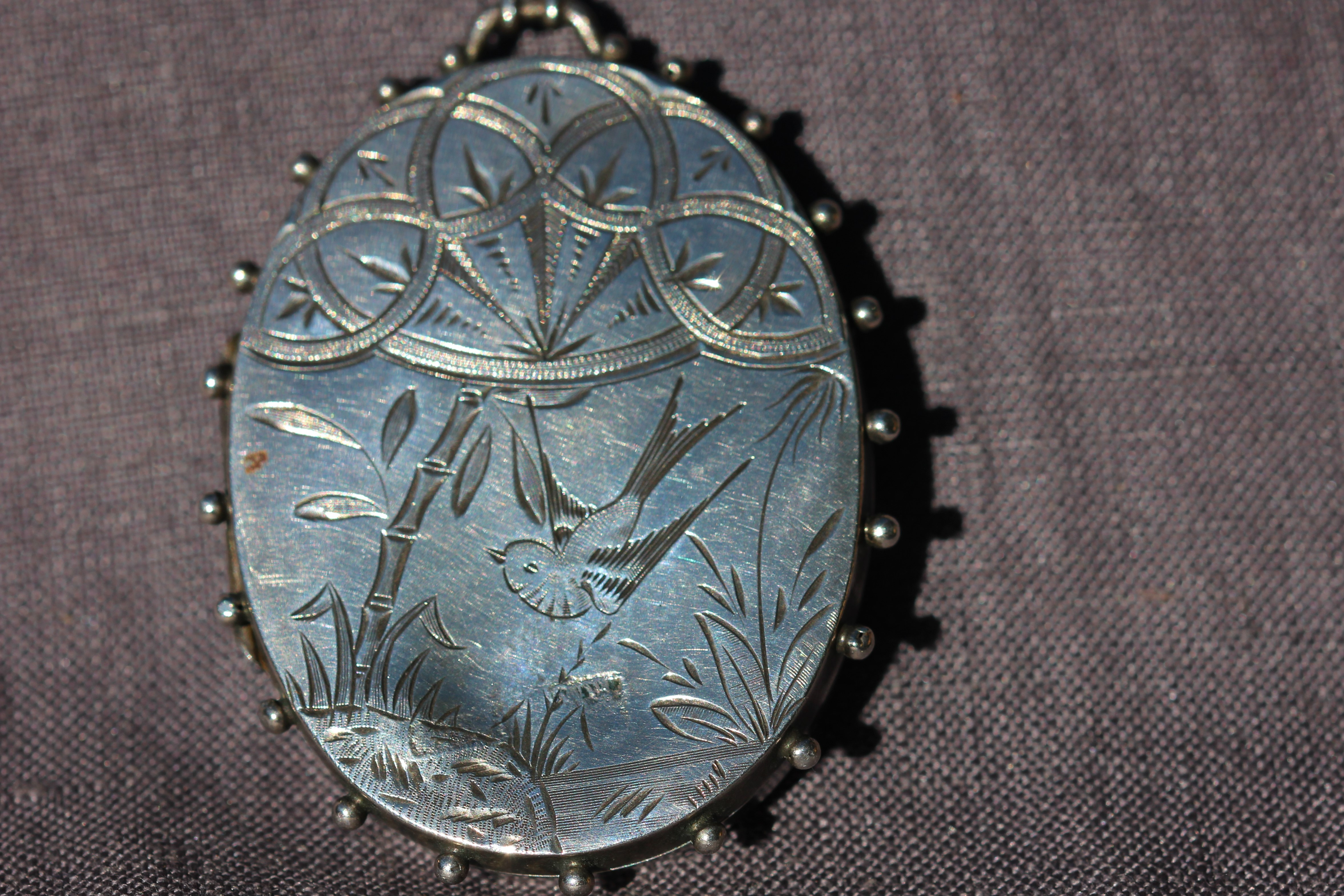 Swallows were also popular in sentimental jewellery, symbolising love, loyalty and joy. They and similar birds also appeared in mid to late Victorian jewellery from the Aesthetic period which was in turn influenced by Japonesque arts. Lightly etched small birds, flowers, bamboo and fans appeared on silver jewellery as seen in the silver locket below.