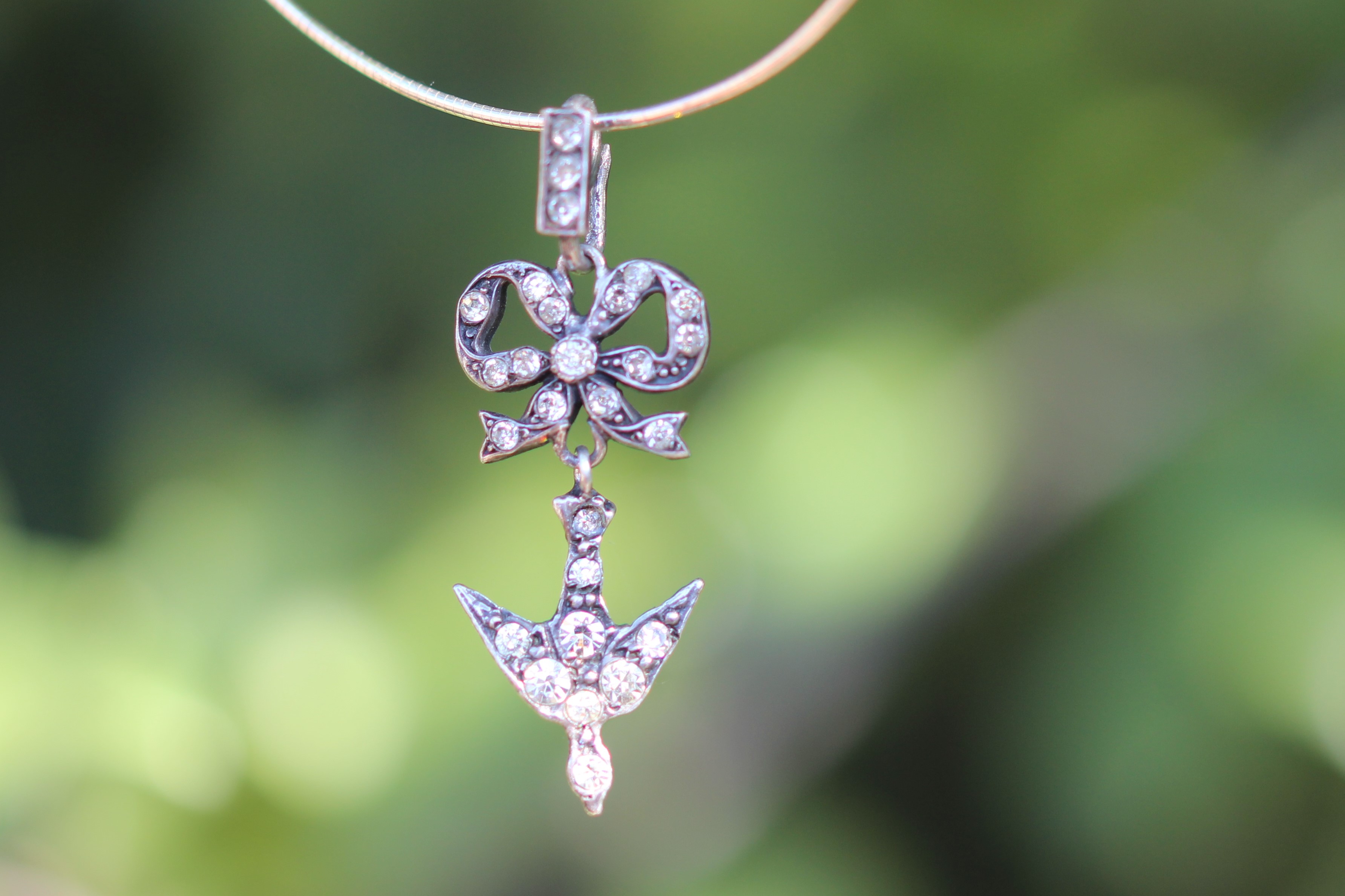 Doves are linked to the Greek goddess Aphrodite (she is also linked with sparrows and a range of water birds) as well as being associated with a number of religions. In particular, in France in the 18th and 19th centuries, it was considered by Catholics as a symbol of the Holy Spirit. They are called Saint Esprit doves. The Saint Esprit dove was represented in diamonds and in paste, usually in flight with wings wide and hanging downwards. They usually hang from bows. Sometimes they carry an olive branch in their beaks, or gemstones of some sort. Generally, doves symbolise love and peace.