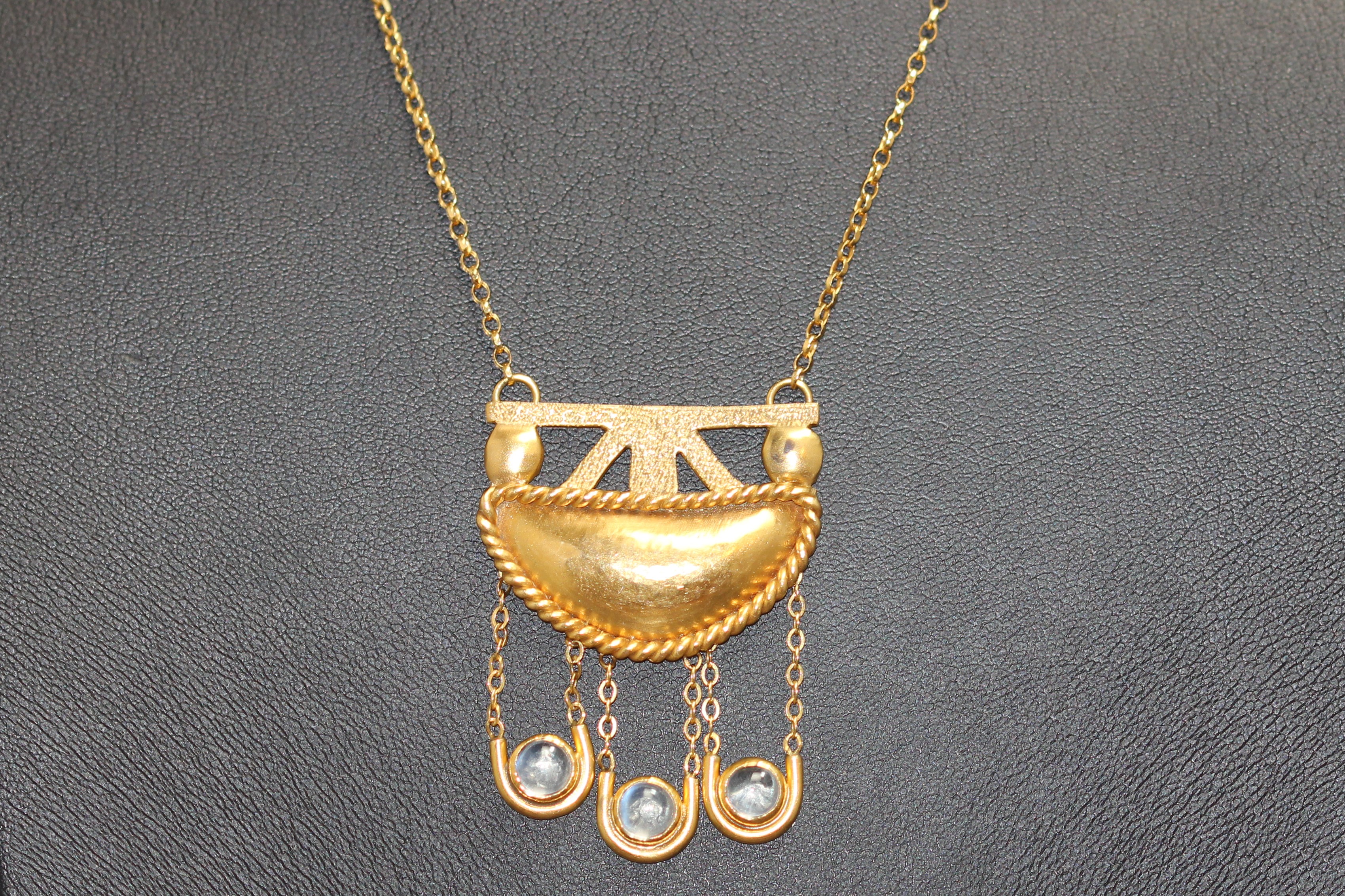 The final necklace is from the 1900s. It is a lovely Arts & Crafts 15ct gold pendant with moonstone dangles on a 45.72cms (18 inches) long 9ct chain. The Arts and Craft movement evolved as a response to the industrialized and mechanized manufacture of jewelry beginning in the mid 1850s and dominating it by the 1880s and1890s. It called for individual pieces to be handcrafted, with a focus on artistic expression and simple lines. Its heyday was from the 1890s through to the beginning of the 1920s and it existed alongside the Art Nouveau period. Moonstones, with their simple beauty and blue adularescence, were a popular stone in Arts & Crafts jewellery.