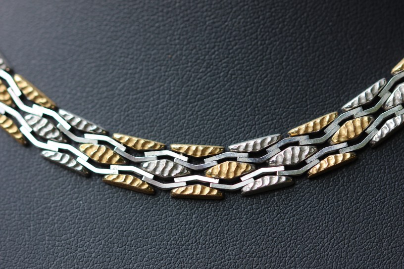 At the top of the post is a lovely 18ct bi-colour gold necklace which can be worn under a shirt or jacket or over a high necked top. It is vintage, hallmarked 1976, and can be worn with either side showing, one showing the yellow gold and white gold colours or the other showing white gold. It is 43cms (17 inches) long. This is such a versatile piece.