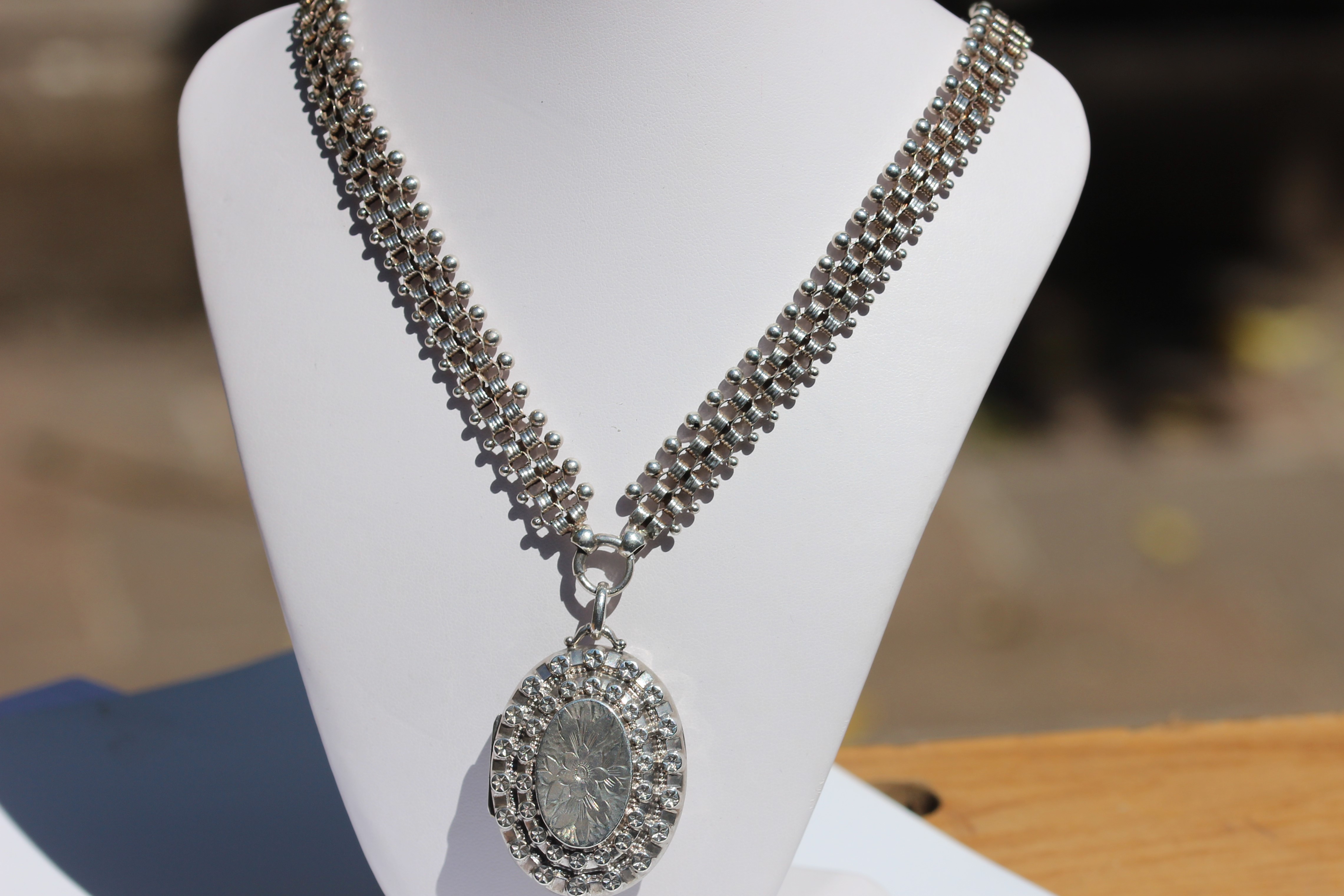 The next piece is a quintessional Victorian silver collar and locket. Collars began to appear around the late 1870s and became an important item of jewellery for the next 20 years. Usually made of silver, the collars ranged from simple to very ornate designs. The lockets and collars were sold separately as well as in sets. They were joined by a pull-back circular catch called a spring ring. The collars came in a wide variety of lengths. This one is 46.4cms (18 ¼ inches). Whilst silver jewellery was made throughout the Victorian period, it was the discovery of silver in Nevada which was to lead to a growth in silver, together with the ever growing middle classes who had money to spare. The links on the collars were usually flattened to allow them to sit flat around the neck.