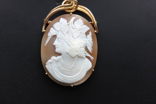 This is a stunning pendant/brooch comprising a gorgeous large Victorian shell cameo set in a 15ct gold frame, depicting probably Dionysus, the Greek god of wine, as symbolized by the grapes and vine leaves on his head. The frame consists of two gold strands drawn together into a knot, and forming a fixed loop for a chain. The piece can also be worn as a brooch as it has a pin and roll over safety clasp. The cameo measures 1 7/8th inches by 1 ½ inches. The frame is 2 ½ inches by 1 ½ inches. The piece weighs 16 grams.