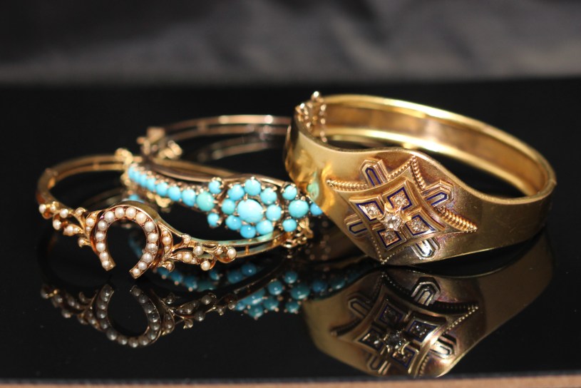 Bracelets, bangles, and cuffs are all different styles of jewellery designed to be worn around the wrist and normally grouped under the heading of bracelet. The word ‘bracelet’ originates from the Latin for arm, ‘brachium’. It became ‘bracel’ in Old French, with the diminutive form becoming ‘bracelet’. We have come to use the word ‘bracelet’ to mean a linked or flexible item which is done up around the wrist with a clasp or hinge. The word ‘bangle’ comes from the 18th century Hindu word ‘blangli’ meaning glass bracelet. It refers to rigid bands around wrist, arms and ankles but we use it to refer to wrist jewellery. We have come to use the word ‘bracelet’ to mean a linked or flexible item which is done up around the wrist with a clasp or hinge while ‘bangle’ is used to cover jewellery which is rigid, either able to be slipped over the hand without a closure or joined with a clasp. Some bangles are not joined into a complete circle, like a cuff.