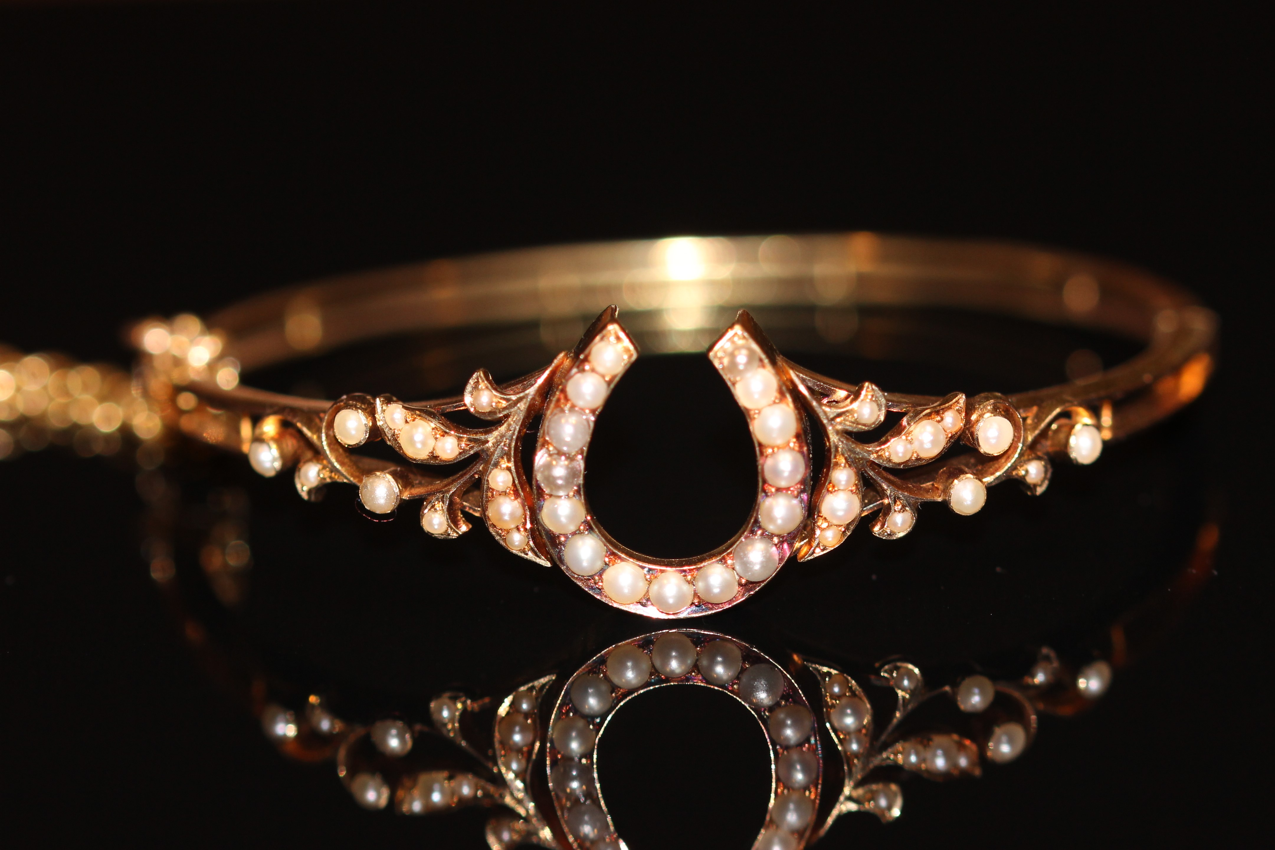The next two bangles are Edwardian, from around 1901 to the beginning of WWI. One is an 18ct gold bangle with a central horseshoe motif set with seed pearls, with a foliate design on each side also set with seed pearls. Double bands of gold rails form the rest of the bangle. The bangle is hinged, with a box clasp and safety chain.